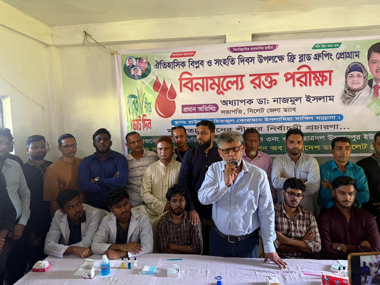ঐতিহাসিক বিপ্লব ও সংহতি দিবস উপলক্ষে সিলেটের ওসমানীনগরে পাঁচ শতাধিক মানুষের বিনামূল্যে রক্ত পরীক্ষা কর্মসূচি অনুষ্ঠিত হয়েছে। বৃহস্পতিবার (৬ নভেম্বর) দুপুরে উপজেলার রাউৎখাই হিফজুল কোরআন ইসলামিয়া দাখিল মাদরাসা হলরুমে এ কর্মসূচি অনুষ্ঠিত হয়।