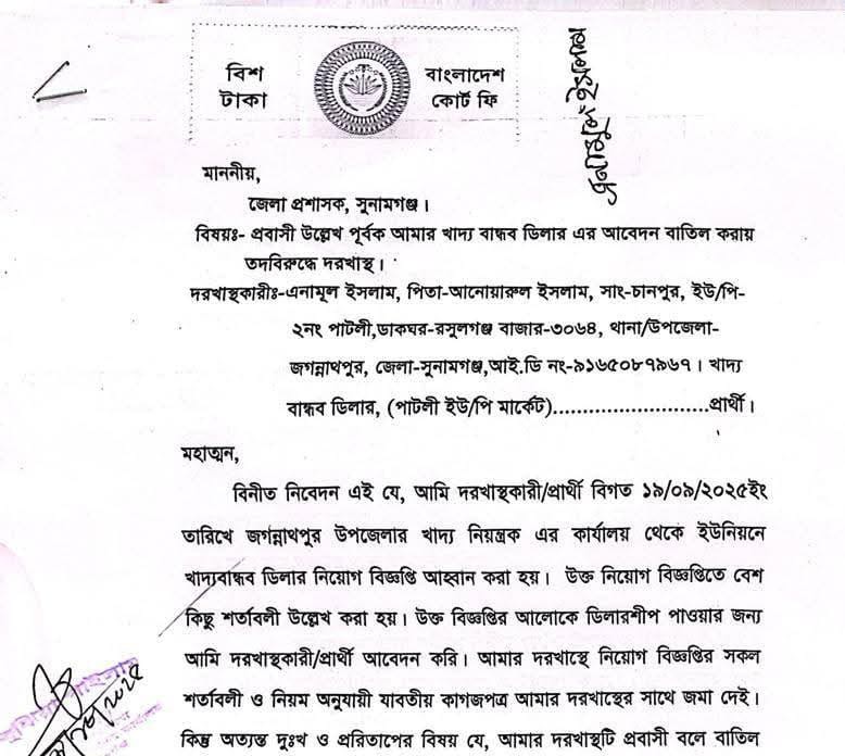 অভিযোগকারী এনামুল ইসলাম পাটলী ইউনিয়নের চাঁনপুর গ্রামের বাসিন্দা। তিনি অভিযোগে উল্লেখ করেন, বিগত ১৯/০৯/২০২৫ ইং তারিখে জগন্নাথপুর উপজেলা খাদ্য নিয়ন্ত্রকের কার্যালয় থেকে উপজেলার অন্যান্য এলাকাসহ পাটলী ইউনিয়ন মার্কেট এলাকায় খাদ্যবান্ধব ডিলার নিয়োগের আহ্বান করা হয়।