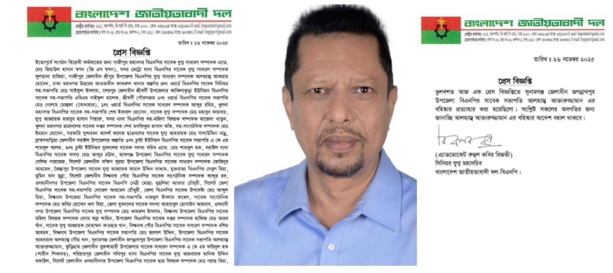 এতে বলা হয়, ভুলবশত আজ এক প্রেস বিজ্ঞপ্তিতে সুনামগঞ্জ জেলাধীন জগন্নাথপুর উপজেলা বিএনপির সাবেক সভাপতি আলহাজ্ব আক্তারুজ্জামান এর বহিস্কার প্রত্যাহার করা হয়েছিলো। সংশ্লিষ্ট সকলের অবগতির জন্য জানাচ্ছি আলহাজ্ব আক্তারুজ্জামান এর বহিস্কার আদেশ বহাল থাকবে।