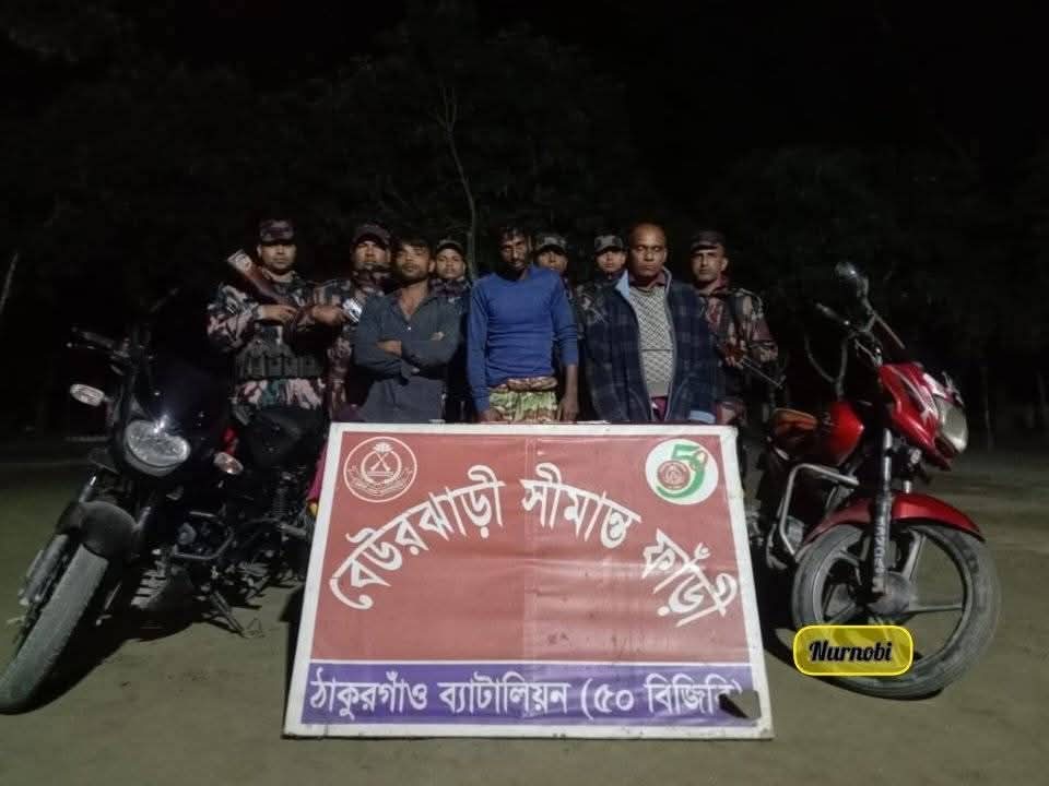 গোয়েন্দা তথ্যের ভিত্তিতে পরিচালিত বিশেষ অভিযানে ঠাকুরগাঁও ব্যাটালিয়ন (৫০ বিজিবি) তিন মাদক ব্যবসায়ীকে আটক করেছে। মঙ্গলবার (১৮ নভেম্বর) রাত ১১টা ৩০ মিনিটের দিকে সীমান্ত মেইন পিলার ৩৮১ থেকে প্রায় দুই কিলোমিটার ভেতরে ‘উদয়পুর মাহাতবস্তি’ এলাকায় এ অভিযান পরিচালনা করা হয়।