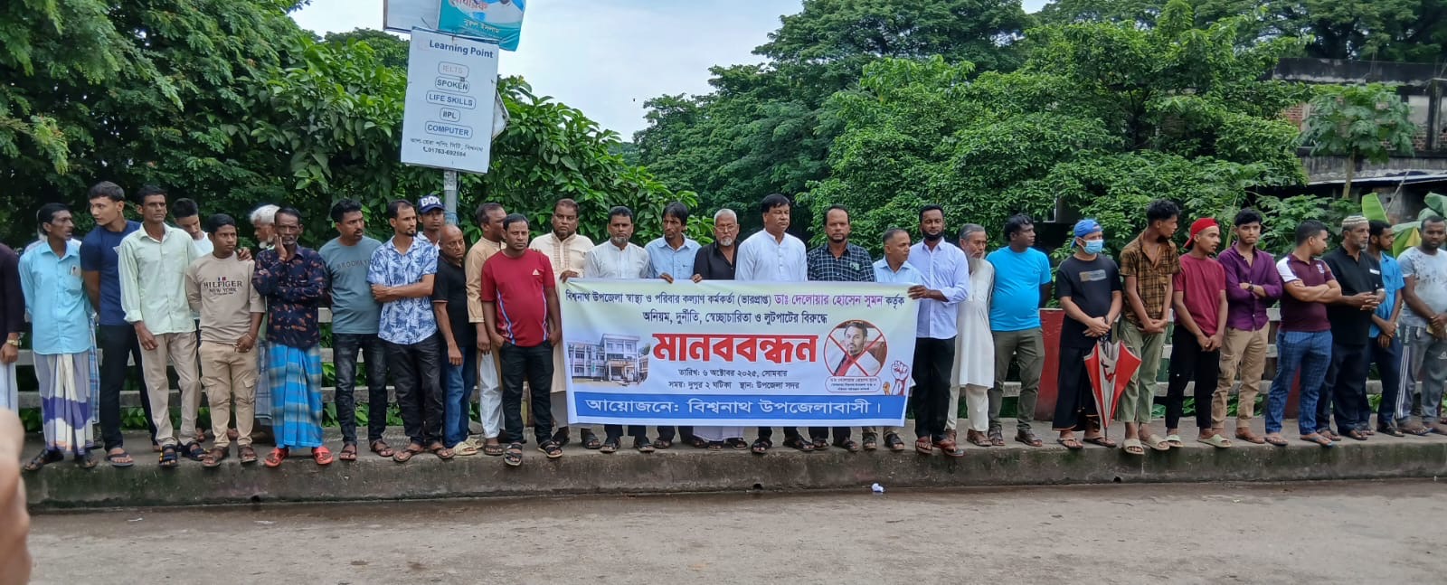 সিলেটের বিশ্বনাথ উপজেলা স্বাস্থ্য কমপ্লেক্সে অনিয়ম ও দুর্নীতির বিরুদ্ধে (সোমবার ৬ই সেপ্টেম্বর) দুপুর ২:০০ঘঠিকায় বিশ্বনাথ পৌর শহরে বাসিয়া ব্রীজে উপর উপজেলা স্বাস্থ্য ও পরিবার পরিকল্পনা কর্মকর্তা ডাক্তার দেলোয়ার হোসেন সুমনের অপসারণের দাবিতে উপজেলাবাসীর ব্যানারে মানববন্ধন করেছে সচেতন নাগরিক মহল।